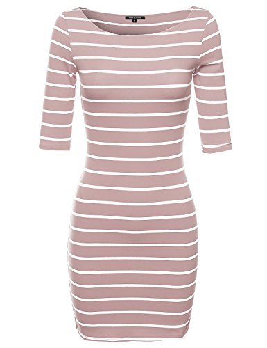 Basic Every Day Boat Neck Stripe 3/4 Sleeve Dress Mauve White S