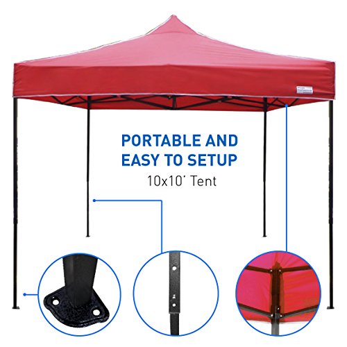 - PORTABLE AND EASY TO SET-UP - EasyGo Easy Up Tents has 10'x10' Steel Frame with Red 420 Denier PVC Oxford Water Repellent Outdoor Canopy Top with 12" Valance.