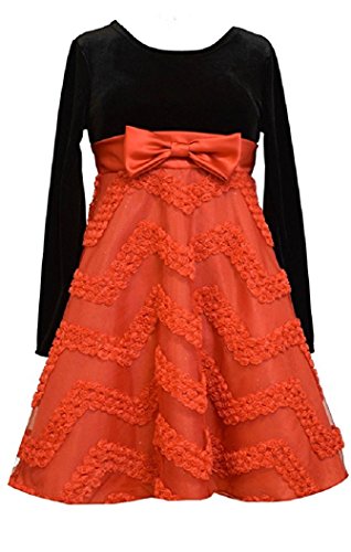 Beautiful black stretch velour dress features red chevron taffeta bonaz design lined skirt. Bow at center waist. Back zip. Long sleeves. Very elegant dress that falls to tea length on most girls.