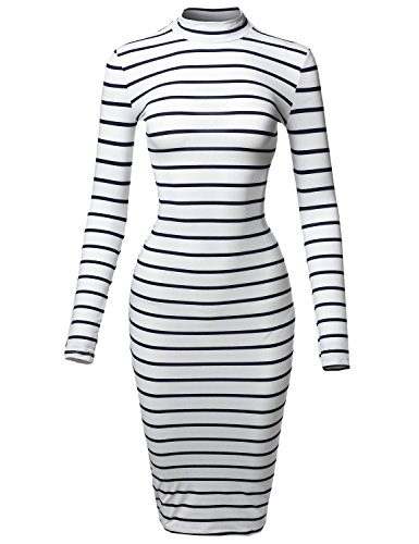 Casual Striped Long Sleeve Mock Neck Midi Dress White Navy L