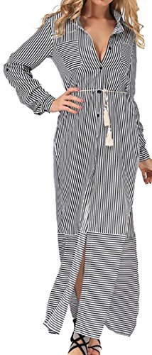 Cruiize Womens Casual Lapel Long Sleeve Striped Button Maxi Dress Black White Small