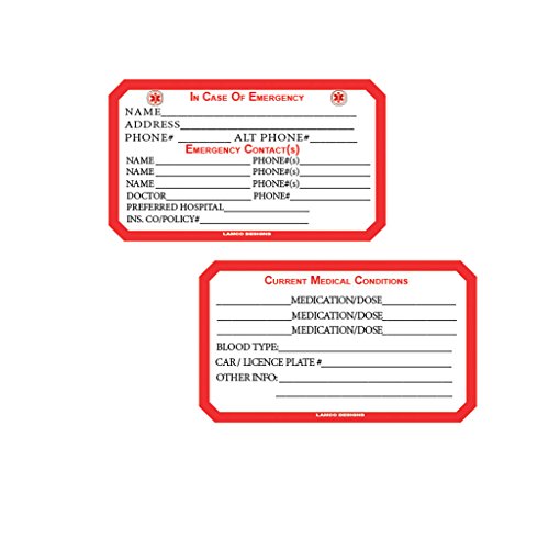 This is a great handy take-along item that can go everywhere with you. Great for older adults to have with them for trips to the market or shopping. A must-have for a summer camper!! Makes it easy to identify known allergies and conditions. Perfect for travel and essential to keep in you passport case!! Don't travel abroad or to a resort without slipping this card into your luggage-- the information on it could be lifesaving! The heavy cardstock has an easy to write on matte finish and can be laminated. Makes a great gift for someone to show you care.