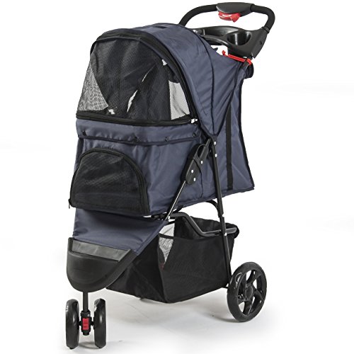 Fur Family Foldable Pet Stroller Cat Dog Cage 3 Wheels, w/ Cup Holder, Dark Blue