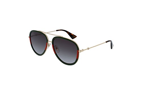 Gucci GG0062SThis simple design from Gucci uses the signature Gucci colours to give the ultimate look. With gold running along the side of the piece you can be sure to take this look to the new level. UV400 lenses. This frame comes with a two years warranty. Colour code: 003Colour: Gold / GreenLens category: 3Lens features: Gradient