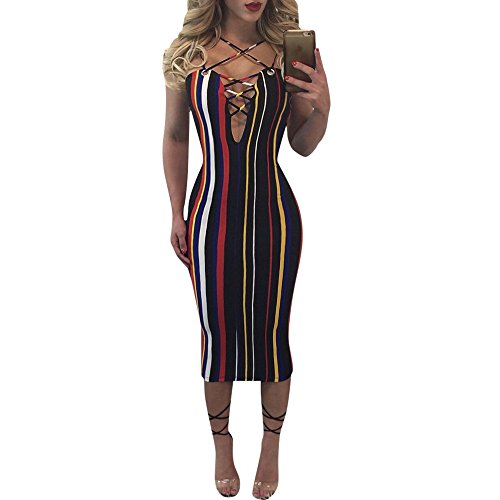 - Hot Sale Women's Summer Sexy Deep V-neck Lace Up Striped Party Club Midi Dress