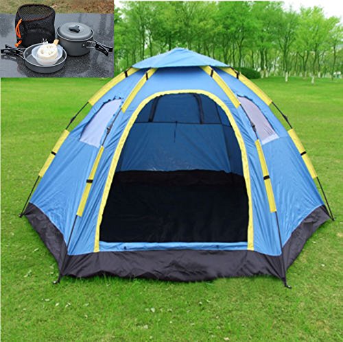 Description: Camp Tent: Unique one piece design for easy setup within one minute Generous ten-by-seven-foot (W x D) footprint creates enough floor space for sleeping up to 5 people Engineered to be a stronger, more wind-resistant frame by using redesigned poles to anchor tents and increase performance Offers great weather protection with water resistant and UV protected material Large arched front door for easy in-and-out 6 mesh panels protect the tent from the insects while keeping the tent breathable Removable blue cap with hooks shields the tent from rain drops and afternoon sun rays Handy storage bag for easy carry and transport 8pcs Outdoor Camping Cookware: Type: Camp Kitchen Material: Aluminum alloy This outdoor cooking set is designed for one or two people. The pot and frying pan are made of anodised aluminum, which makes it solid and light. There are foldable handles on pot, frying pan and soup spoon. After use, they can be folded to save space. Small size and portable. And al