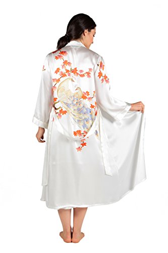This romantic hand painted silk robe and gown set features one of the most beautiful paintings in our collection. The robe, on the back, features a pair of majestic peacocks perched on a tree brimming with deep red autumn colors. The painting flows into the front of the robe as well as the gown. Each garment has been carefully hand painted. A great gift for any occasion!
