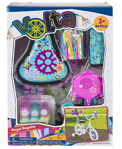 - PRODUCT SPECIFICATIONS 1 Package of Volta Royal Regalia Bicycle Decorations & Accessories includes 36 spoke beads, 2 streamers, 2 frame pads, 1 seat cover, 1 bell, 1 flag, 1 wheel insert, 1 mirror, and 1 sheet of stickers. For ages 3 and up.
