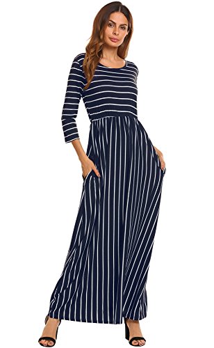 Women 3/4 Sleeve Casual Elastic Waist Striped Flare Long Maxi Dress with Pockets (XL, Navy Blue)