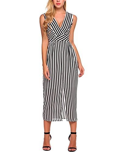 Zeagoo Women's V-Neck Sleeveless Striped Split Front Slim Casual Maxi Dress with Pocket