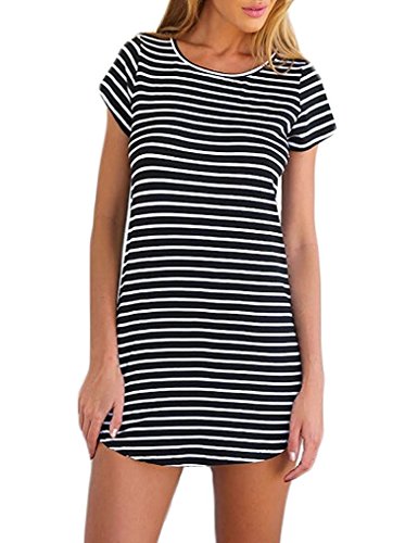 Mesonna Women's Crew Neck Short Sleeve Striped Loose T-Shirt Mini Dress (L, Black)