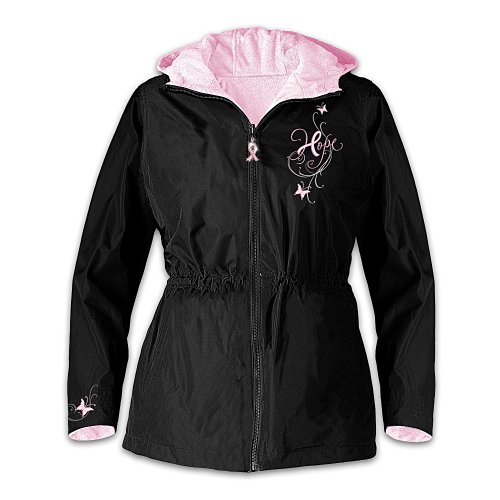 Wrap yourself in the beauty of hope - and a custom wardrobe essential - with this breast cancer support women's jacket, an inspiring design exclusive from The Bradford Exchange. You'll wear it with pride, knowing that a portion of the proceeds from your purchase will be donated to help find a cure for breast cancer.Finely crafted in striking black polyester with soft pink fleece lining, this hooded anorak jacket is embroidered on the front and back with the word "Hope" and a pink ribbon design. Printed pink butterflies make elegant accents, and an enameled pink ribbon zipper pull adds fashion inspiration. The jacket hits at mid-thigh with a cinched waist for a flattering fit. Sure to become an essential part of your wardrobe, it also makes a thoughtful gift. Passionate demand is expected for this outerwear exclusive, so don't miss out. Order now! An enameled pink ribbon zipper pull adds fashion inspiration The jacket hits at mid-thigh, and a cinched waist provides a flattering fitArti