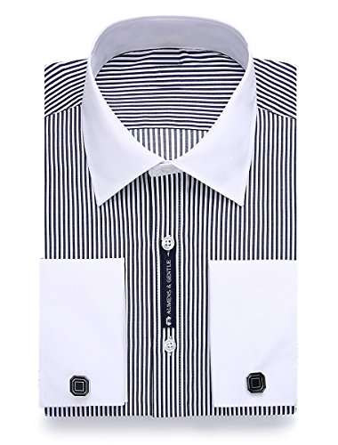 Alimens & Gentle Contrast Collar Stripe French Cuff Slim Fit Dress Shirts(Color: Stripe Black, Size:17" Neck - 34"/35" Sleeve)