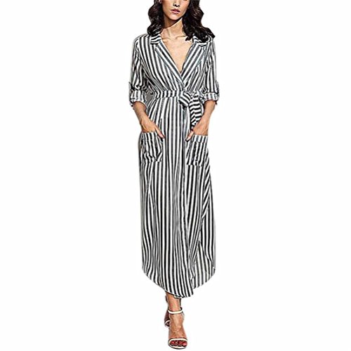 Womens Dress,Kaifongfu Stripe Belted Deep V Neck Long Sleeve Top Blouse Long Maxi Dress (XL, Black)