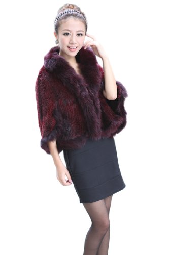 Queenshiny Women's Knitted Mink Fur Cape With Fox Collar-Wine Red-XS(0-2)
