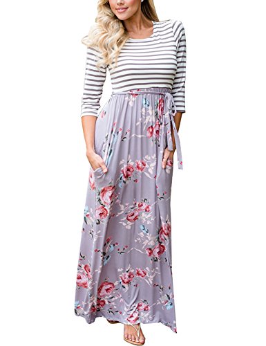 Murimia Women's Floral Print 3/4 Sleeve Empire Flower Pocketed Maxi Casual Dress With Belt