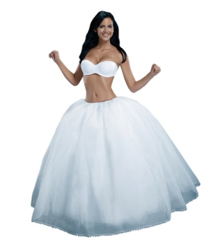 Merry Modes Mega Full crinoline slip petticoat - also called the Quinceanera. But it's a perfect mega full slip without the hoops! This slip meets safety standards (see below). Beware of buying cheaper, more dangerous garments! Features Drawstring waist closure fits 24 inch to 36 inch waist (size 4 to 20). This crinoline is by far the fullest slip made. It's a 7-layer petticoat beginning at the waist - more layers than other similar garment out there. Taffeta lining is 40 inches from waist to bottom hem. Thousands of inches of flame retardant netting in the middle, and Merry Modes famous scratchless netting covers the outside.